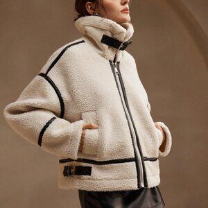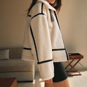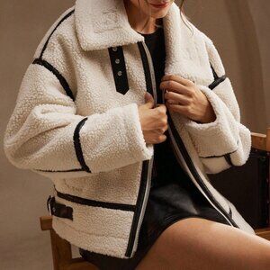 Stay warm this winter with this beige oversized short jacket, featuring a fleece thick and faux leather patchwork design, long sleeves, and a casual fit.