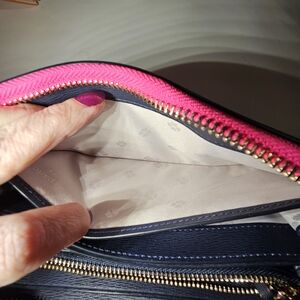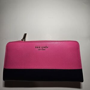 Authentic Kate Spade Spencer Zip-Around Continental Wallet, also known as the popular Lacey style. This wallet features a striking two-tone color block design with a "shocking" magenta pink on top and navy blue on the bottom.