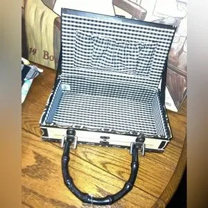 Bamboo style handles on top. Interior is lined with gingham fabric.