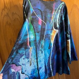 Keywords: Jess & Jane, tunic top, abstract print, long sleeve top, casual top, artsy top, made in USA, women's top, size S, blue top, high low hem, designer top, unique top, bohemian top, comfortable top