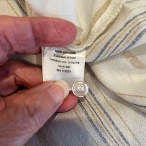 Gentle Fawn Crepe Button Front Shirt White w/ Tan Navy Pocket Oversized XS. Excellent condition. See photos for details and measurements. Light and airy, great for layering, all season, fall, winter, spring, summer, vacation, beach, pool, brunch, dinner, date night, office, long length white with gold/tan and blue stripes, chest pocket, button cuffs, classy, executive