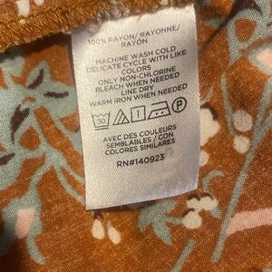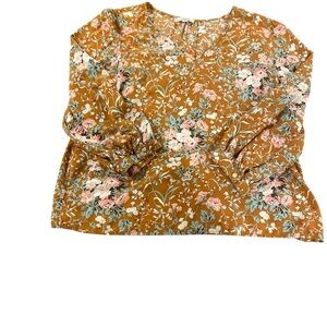 Charming floral blouse with a warm brown base. Features delicate pink and white flowers. Perfect for casual elegance.