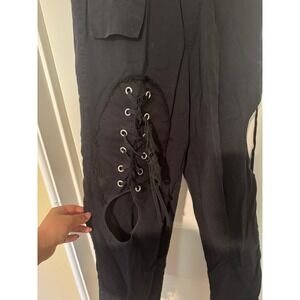 Edgy black joggers with unique distressed detailing. These pants feature a comfortable fit with an elastic waistband and a modern silhouette. The standout design includes lace-up accents and strategic cutouts, adding a bold and trendy touch. Perfect for making a statemen.