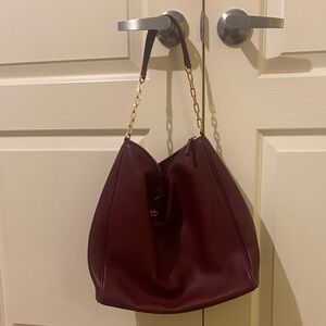 Chic Tory Burch hobo bag in deep red. Features a gold chain strap. Perfect for everyday elegance.