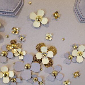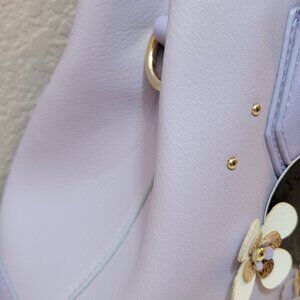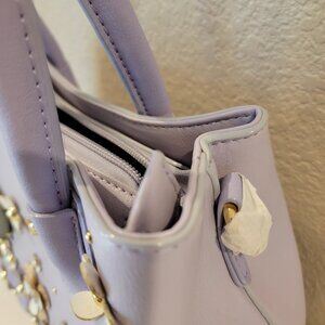 New with tags Imoshion USA satchel in a soft lavender tone, detailed with delicate floral appliqués and gold-tone accents. Made from vegan leather and structured to hold its shape beautifully.