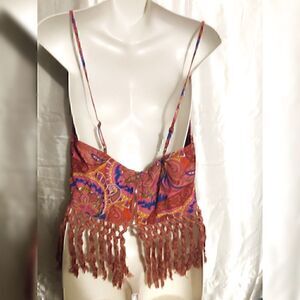 Bohemian Paisley Floral Print Zipper Back Fringe Hem Cami Top L