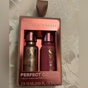 Smoke & Mirrors “Perfect Couple” makeup set featuring a liquid highlighter and liquid blush. This duo is designed to create a soft, natural glow with buildable coverage that blends easily over foundation.