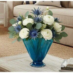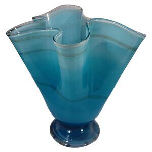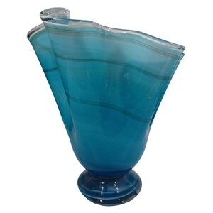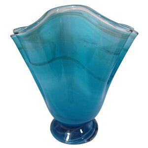 Hand Blown Ocean Waves Blue Art Glass Pedestal Vase Murano Mid Century Decor