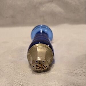 Cobalt blue glass salt shaker with a silver-tone metal perforated lid. The glass body features a ribbed design for visual appeal and tactile grip, leading to a flared base. The top metal cap has a classic shaker design with multiple small holes for dispensing contents.