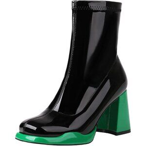 Women's Green Chunky Heel Ankle Boots Square Toe Mid Calf Side Zippers Boots