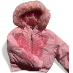 cuz you can't complain. This puffer comes in a corduroy construction, with a hood, faux fur trim, butterfly applique details, rhinestone details, and a zip closure.
