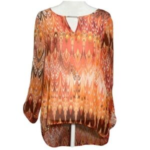 Blouse featuring a vibrant abstract chevron pattern in sunset tones of orange, red, and brown. The lightweight, semi-sheer fabric flows beautifully and is perfect for layering. Features a high-low hem and subtle keyhole front neckline for extra style.