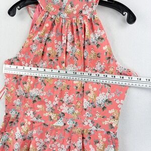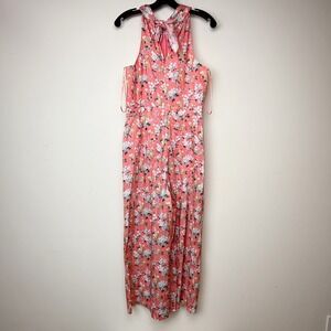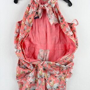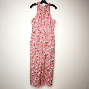 Charming halter jumpsuit featuring a vibrant floral print and a flattering silhouette. This J. Crew jumpsuit, crafted with Liberty fabric, showcases a halter neckline that ties at the back, leading to a flowy, wide-leg design. The jumpsuit features a coral-colored floral print with white and yellow accents. Additional details include a concealed back zipper and a comfortable, lightweight feel, perfect for warm weather occasions.