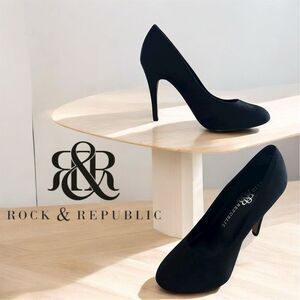 Keywords: Rock & Republic, women's pumps, black heels, stiletto, pointed toe, formal shoes, elegant, sophisticated, textile upper, slip-on, ultra-high heel, size 7.5, pre-owned, excellent condition.