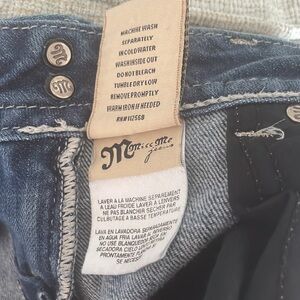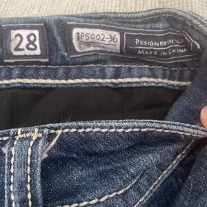 Chic Miss Me jean shorts with a distressed look. Features classic blue denim and stylish stitching. Perfect for casual wear.