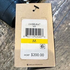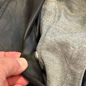 Stylish and edgy, a Levi Strauss & Co. moto jacket in black faux leather with a detachable gray hoodie. Features include an asymmetrical zip front, zippered pockets, snap-down lapels, and a removable belt at the waist for a customizable fit. The jacket combines the classic biker look with a casual, comfortable twist thanks to the soft hoodie. This versatile piece is perfect for adding an extra layer of warmth and style to any outfit. Ideal for weekend outings, casual meetups, or adding a bit of edge to everyday wear.