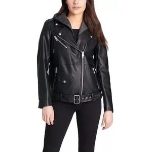 Keywords: Levi Strauss Jacket, Moto Jacket, Faux Leather Jacket, Hooded Jacket, Black Jacket, Womens Jacket, Biker Jacket, Removable Hoodie, Belted Jacket, Levi Strauss & Co., Asymmetrical Zip, Casual Jacket, Outerwear, Fashion Jacket