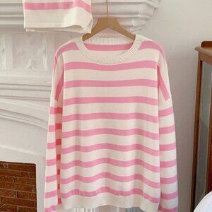 Pink & white Casual Women's Striped knit Sweater and Shorts Set