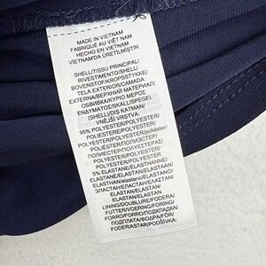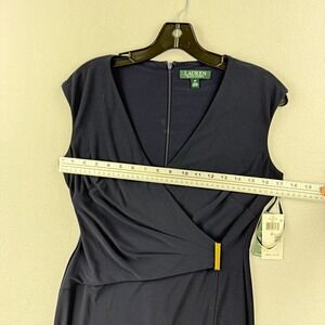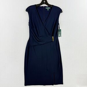 A sophisticated navy blue sheath dress from Lauren Ralph Lauren. This sleeveless design features a flattering V-neckline and elegant ruching across the waist, accented by a stylish gold buckle detail. The dress includes a subtle side slit for ease of movement.