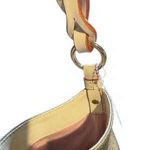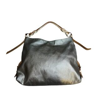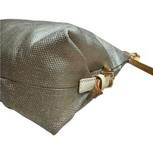 Dooney & Bourke Courtney Sac hobo bag in a metallic silver or pewter coated canvas, featuring natural leather trim and a braided shoulder strap. This particular style, the Courtney Sac, is known for its slouchy, extra-large capacity and a comfortable, thick shoulder strap.