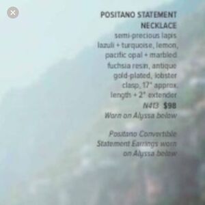 The unmistakable colors of the Positano coastline come alive in this versatile necklace . Vivid semi-precious lapis lazuli, turquoise + fuchsia-dyed jade echo the animated colors of the brilliantly-painted buildings of this village nestled in the hill. Tell a story all your own by wearing this necklace your own unique way. antique gold-plated nickel-free plating 22" approx. length semi-precious lapis lazuli, turquoise, + fuchsia dyed jade, pacific opal + clear crystal, lemon yellow