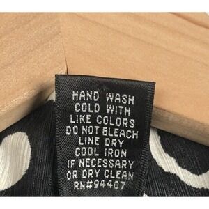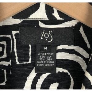 This beautiful iOS Silk & Linen Jacket in size Medium features a unique abstract pattern on a textured material, with a short length and long sleeves. The jacket has a button closure and a regular fit. Perfect for many occasions. It offers a lightweight and breathable option for year-round wear, adding a touch of artistry to any wardrobe. The black and ivory color combination adds a classic yet stylish touch to this unique piece.