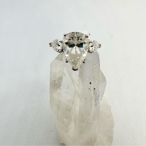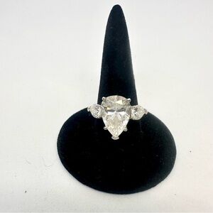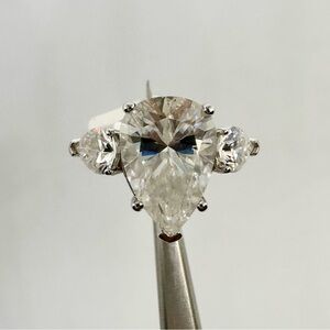 3-stone moissanite ring featuring a 3 carat pear-cut center stone, flanked by two brilliant accent stones. Luxury ring perfect for engagements, anniversaries, or as a bold addition to your fine jewelry collection. 4 Carat pear-cut 3 stone moissanite ring.