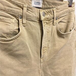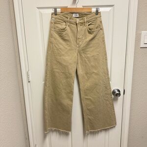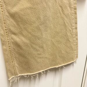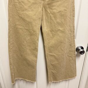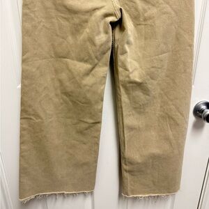 Size 27. Tan high rise wide leg denim pants. Raw hems. Inseam is 27". A couple of small spots on bottom front of pants pictured. Otherwise in good condition. LR6-26