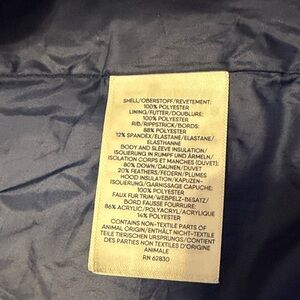 Lands End dark blue down (80% down, 20% feathers) puffer coat. Size 2X. Very long. Vent zippers on two sides. Adjustable hood. No rips or visible stains. Inside snap pocket for phone and outside deep snap pockets. Features a faux fur trim on hood. Ideal for cold weather.