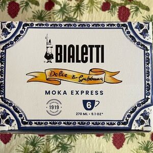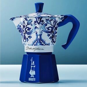 Large six cup Bialetti Moka Dolce & Gabanna stovetop expresso maker. The Blu Mediterrano Dolce & Gabanna Caretto design is attractive and desirable.