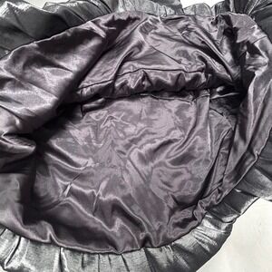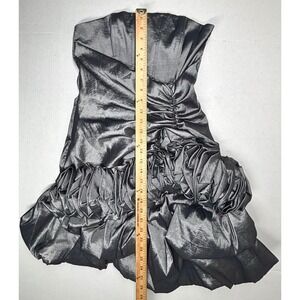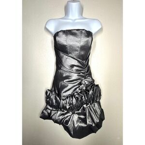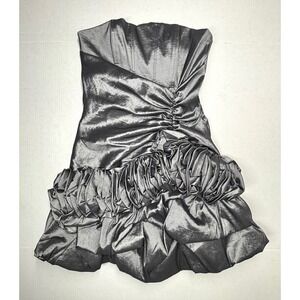 VTG Metallic Silver Strapless Dress Medium Ruched Rosette Bubble Hem ICONIC EUC