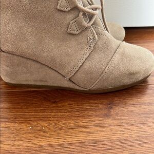 Elevate your style with these Toms tan wedges, crafted from soft suede for a polished look. The wedge heel provides a comfortable lift, making them perfect for transitioning from day to evening wear. With a clean silhouette and classic design, these shoes are a versatile addition to any wardrobe. Size 7, excellent condition, one small mark on the side of the R boot, as seen in photo.