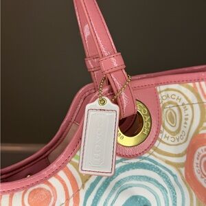 Great used condition beach tote with pink patent leather trim. Features gold hardware and dog leash closure. Comes with white patent leather with pink trim hangtag. Please note some callouts: slightly twisted back strap (does not affect carrying the bag properly), small dark spot on interior, and some slight dark spots in corners which are only visible when looking close at the bottom. All of these are shown in the pictures. Bidding/offer/buy now acknowledges you have inspected pictures carefully. No rips, tears, or odors. Smoke free home.