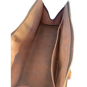 Pre-owned vintage condition with noticeable wear throughout. Vachetta leather shows darkening, wear, and marks consistent with age. Interior shows visible staining and signs of use. Canvas remains intact with no major tears. Zipper functions properly. Please review all photos closely for full condition details.