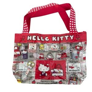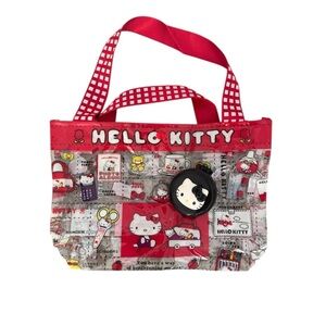 Perfect hello Kitty gift! Cute Hello Kitty transparent tote bag with red accents. Features fun Hello Kitty graphics and a matching hairbrush.