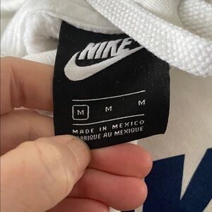 Classic white Nike hoodie. Features bold orange swoosh and blue text. Perfect for casual wear.