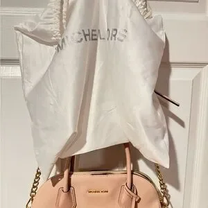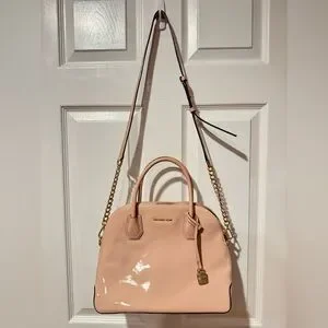 Stylish Michael Kors satchel in glossy blush leather. Features elegant gold-tone accents. comes with longer strap and dust bag! only worn once, make me offer :)
