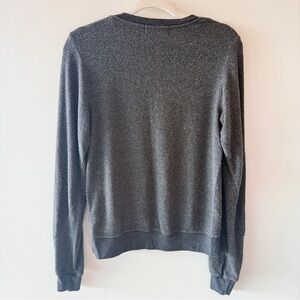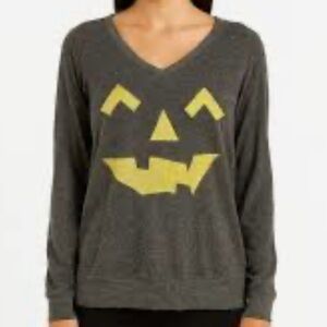 Wildfox Halloween pullover featuring the iconic jack-o’-lantern face on a charcoal gray knit base. Relaxed fit with a V-neckline and soft stretch fabric.