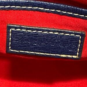 Stylish navy tote with a colorful scarf detail. Ideal for everyday elegance. This bag features two outside pockets perfect for quick key card and phone access, a zippered pocket inside along with a snap half pocket. Six pockets in total!! She is ready for work. 3”x 11”x14”. Some wear on lining. No call outs on the outside of the bag. Comes with COA.