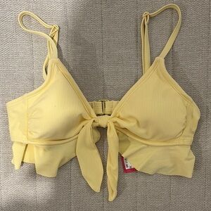Stylish yellow bikini top by Xhilaration. Features adjustable straps and front tie detail.