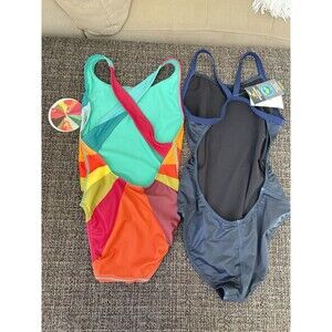 The product is a set of two Sporti swimsuits in size 28/S. These one-piece bathing suits are designed for women and feature a vibrant multicolor pattern inspired by melanin. The shark print adds a fun and unique touch to the park-themed design, making them perfect for a day at the beach or pool, also competitive swim practice. Made by the brand Sporti, these swimsuits are sure to provide comfort and style for all your water activities.