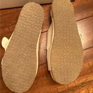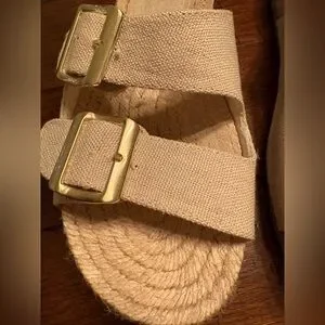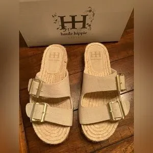 Chic Haute Hippie sandals with tan straps. Features brushed gold buckles and natural fiber foot bed. Ideal for everyday style.