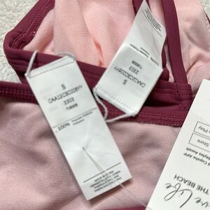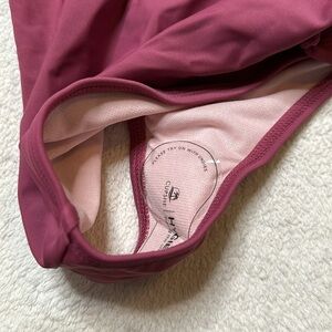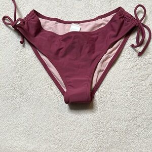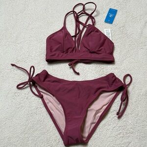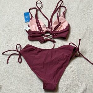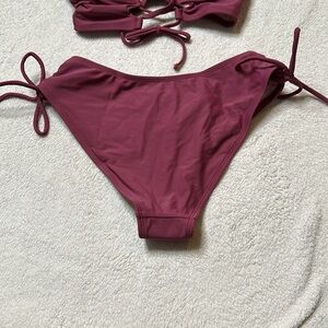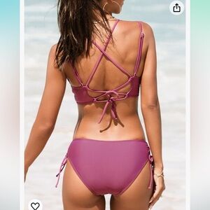 MWT!! Deep Rose color : Keep your beach vibe sexy and chic in our two piece v neck bikini set. The bikini bralette features a self tie crisscross back and adjustable spaghetti straps. Matching a mid rise high leg cheeky bottom with strappy sides