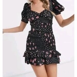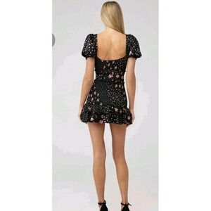 NWOT For love & Lemons black pink floral ruffle hem Camellia Mini Dress Medium