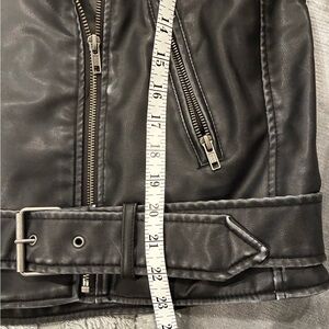 Stylish black faux leather jacket. Features silver hardware. Perfect for a chic look.