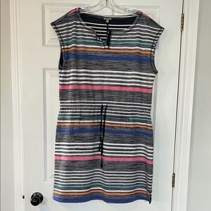 Stylish dress with colorful stripes. Features a drawstring waist. Ideal for casual wear.