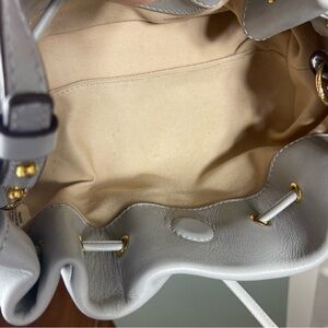 Excellent preowned condition. A few scuffs as pictured. Calf leather. Cotton lining. Made in Italy. Removable and slightly adjustable strap. Magnet and drawstring closure. 9” in width, 4” in height and 4.5” in depth.