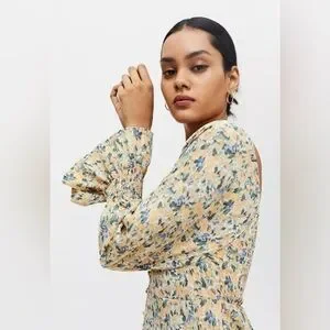 Plunging sweetheart neckline. Buttoned at the front with a fitted silhouette and dramatic smocked sleeves. Smocked back with a back zip closure. New with tags.