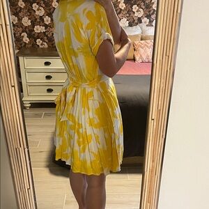 Chic mini dress with bold yellow floral pattern. Lightweight and stylish for any outing. Has a beautiful tie to the back which means flatters to your size.
