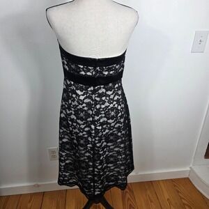 Keywords: White House Black Market, strapless dress, lace dress, midi dress, cocktail dress, evening dress, formal dress, velvet trim, sweetheart neckline, black dress, elegant, sophisticated, party dress